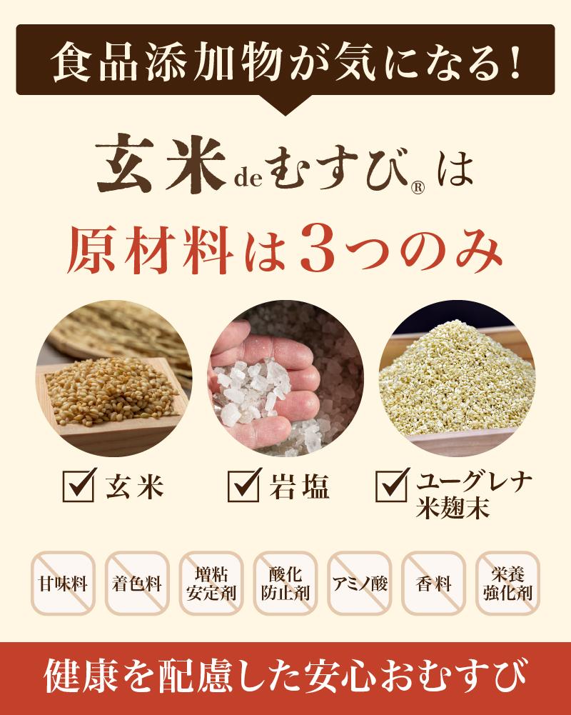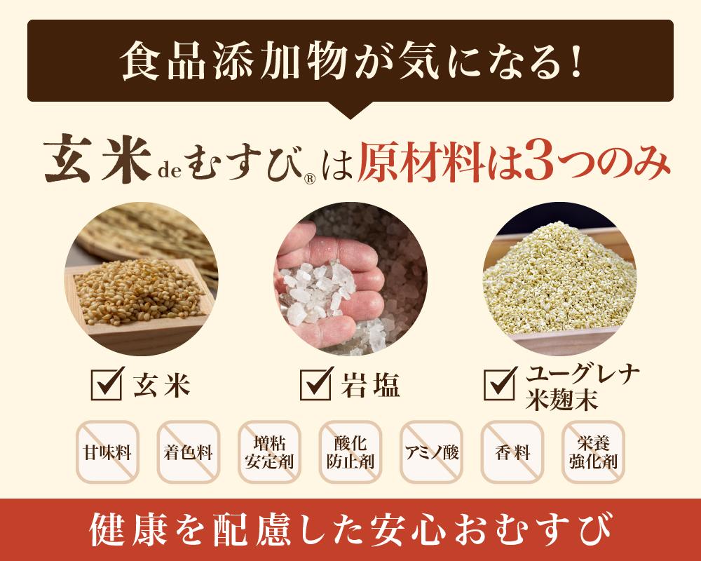 「玄米deむすび」なら原材料は玄米、岩塩、米麹粉の3つのみ